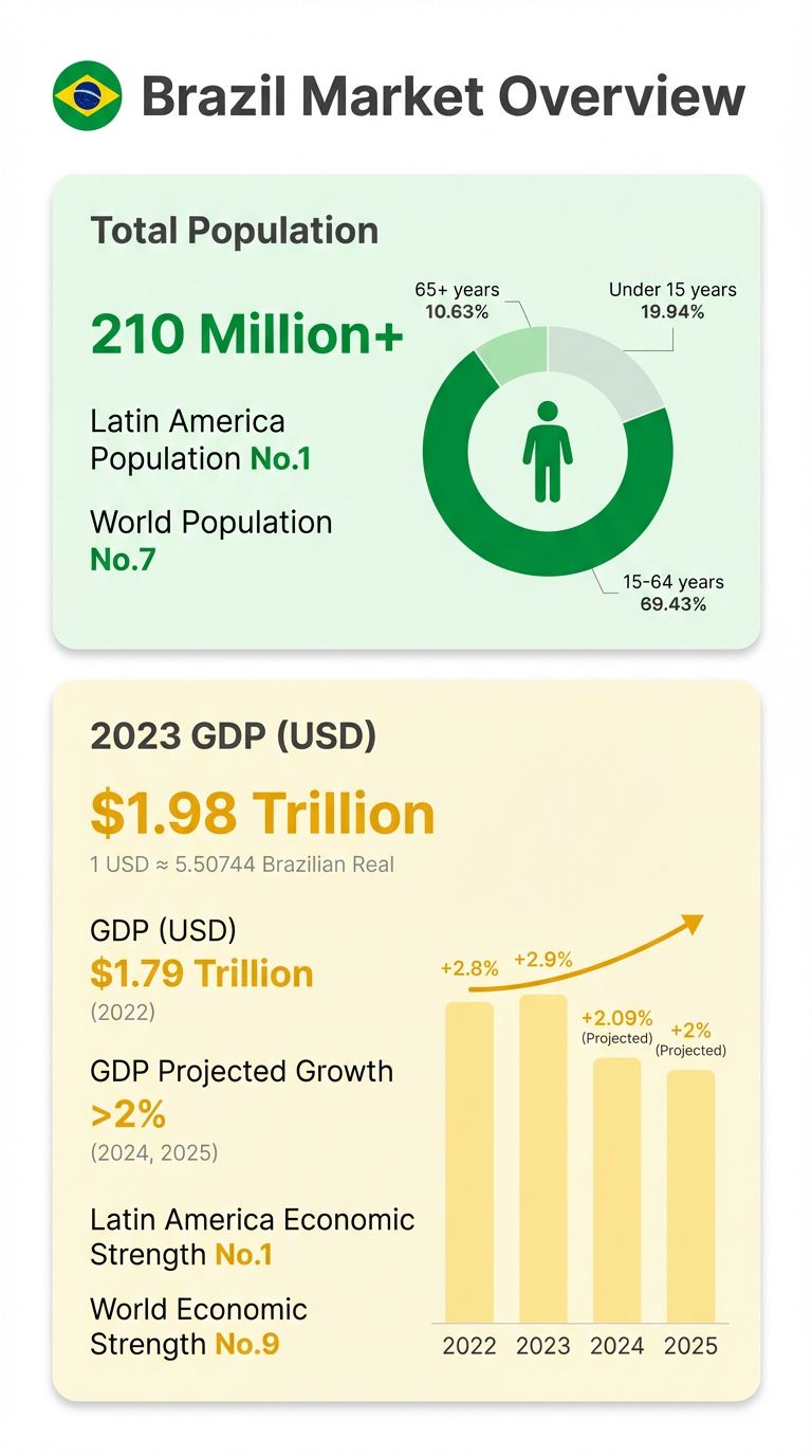 Brazil is the largest economy in South America, with a population of 215 million, ranking 1st in Latin America and 7th globally.