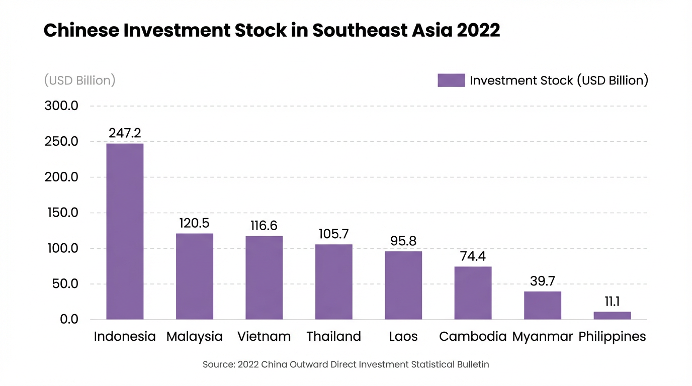 Since 2017, China's investment in ASEAN has outpaced investment in the EU and US. Indonesia received the largest stock of Chinese investment (nearly $25 billion), concentrated in Manufacturing (25%), ICT (18%), and Real Estate (17%).