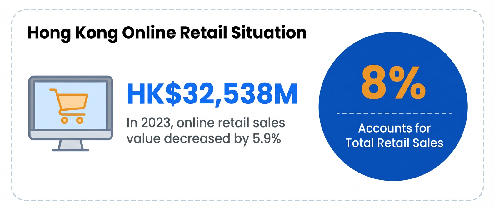 - E-commerce: The Untapped Goldmine In 2023, online retail sales were HK$32.5 billion, accounting for only 8% of total retail. Compared to Mainland China's 27%+ penetration, Hong Kong is a massive "Incremental Market." Statista predicts the e-commerce market size will nearly double by 2025, with over 6.5 million online shoppers.