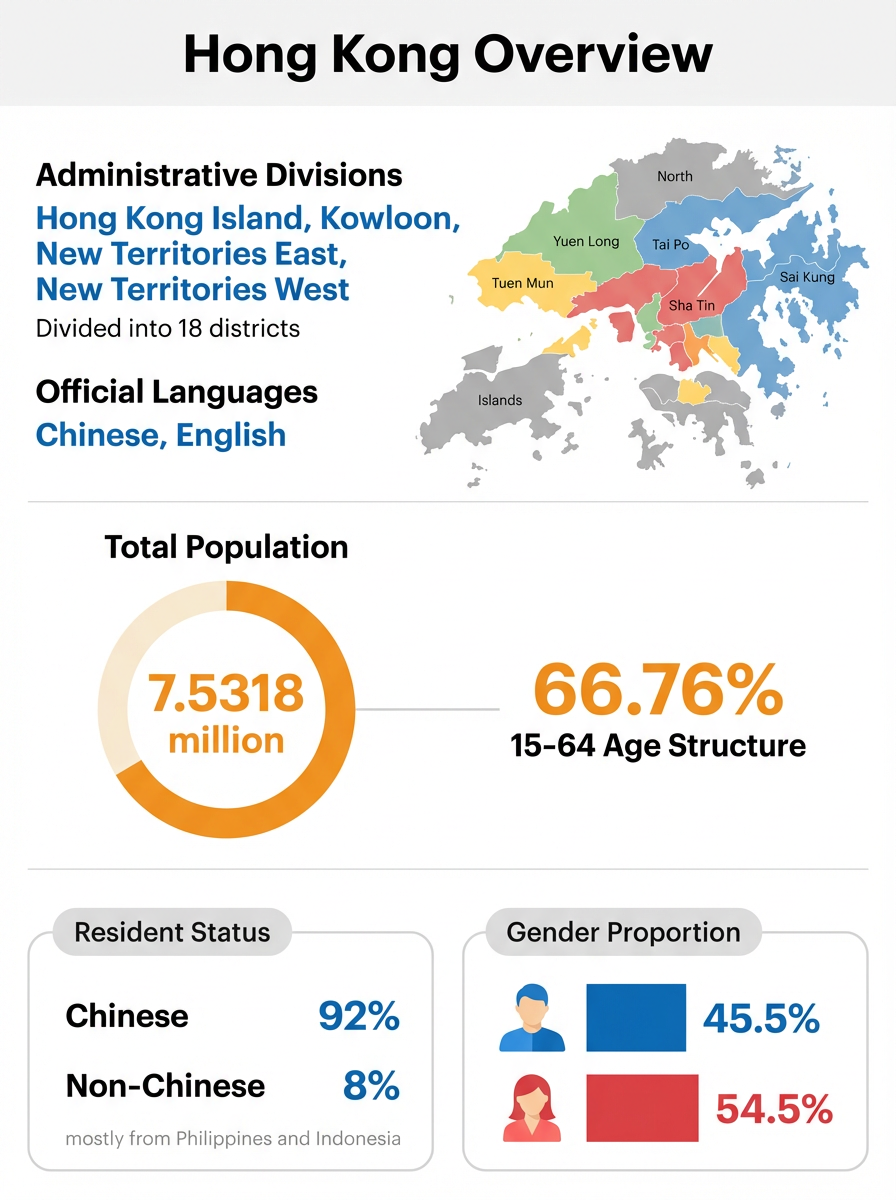 - Basic Facts Hong Kong is one of the most densely populated regions globally, with 7.53 million people (mid-2024) living on 1,114 sq km.