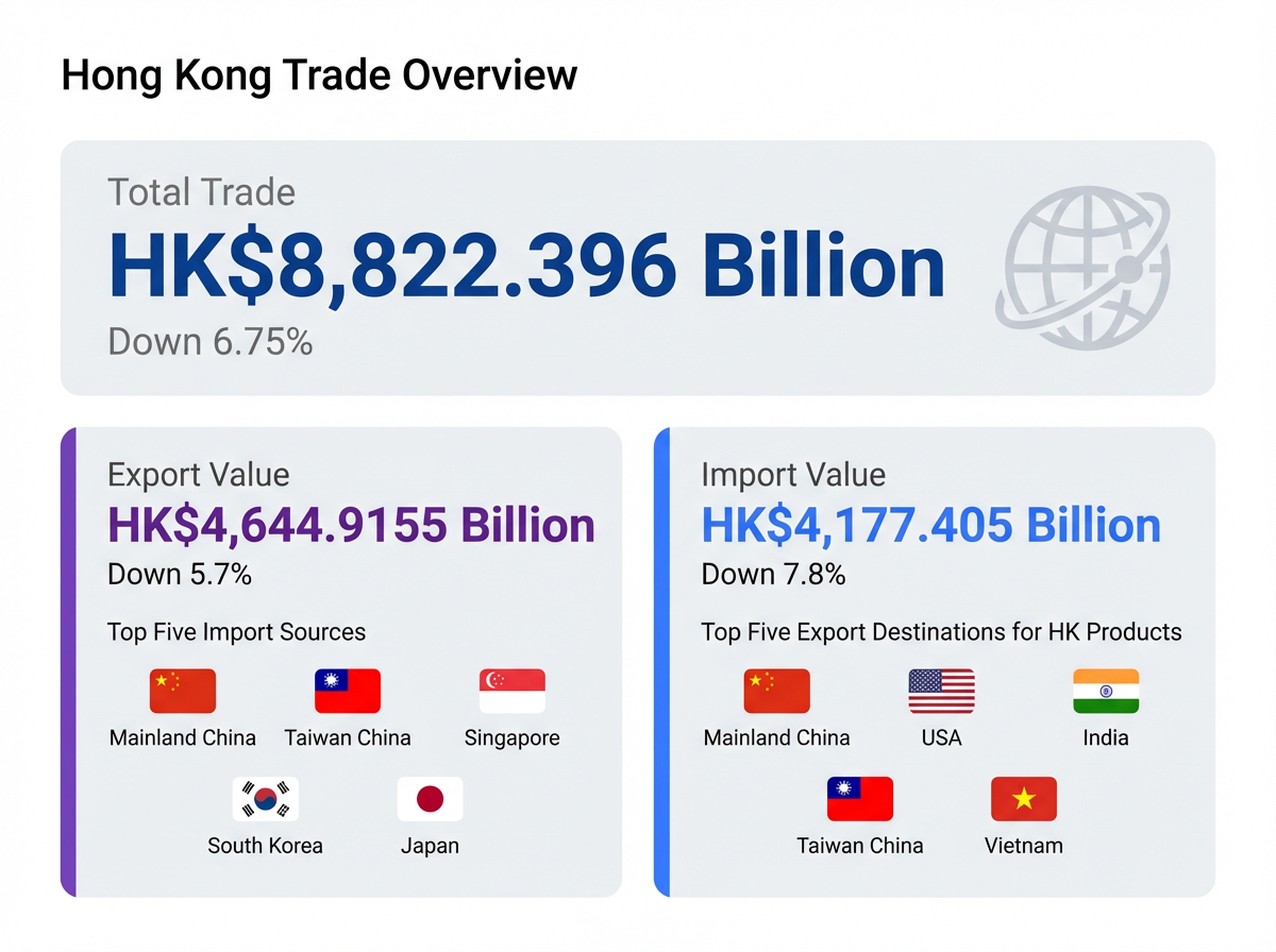 - Trade Hub In 2023, Hong Kong's total external trade reached HK$8,822.3 billion (approx. US$1.13 trillion). It remains a critical gateway for mainland enterprises expanding globally.