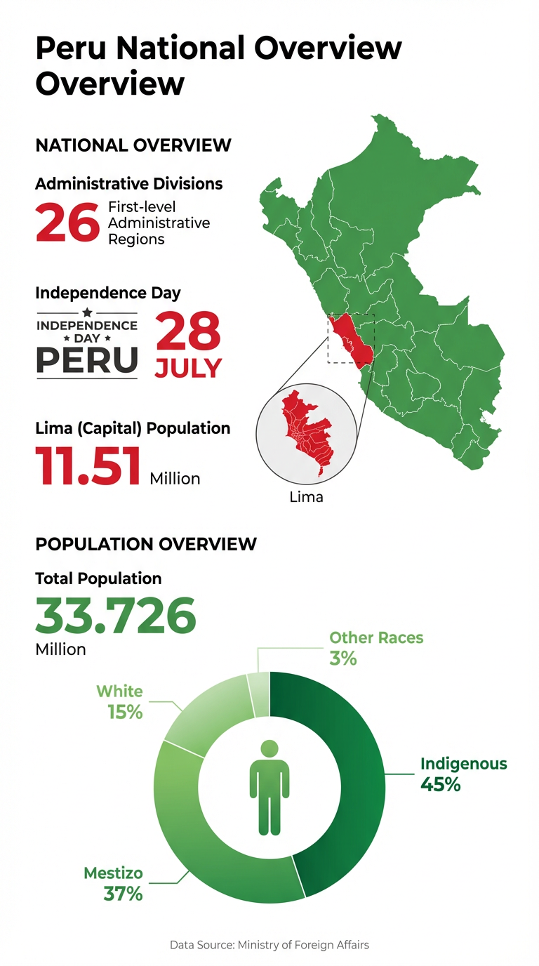 Peru is the 4th largest country in Latin America, covering 1.28 million sq km. It has a population of 33.72 million (2023).