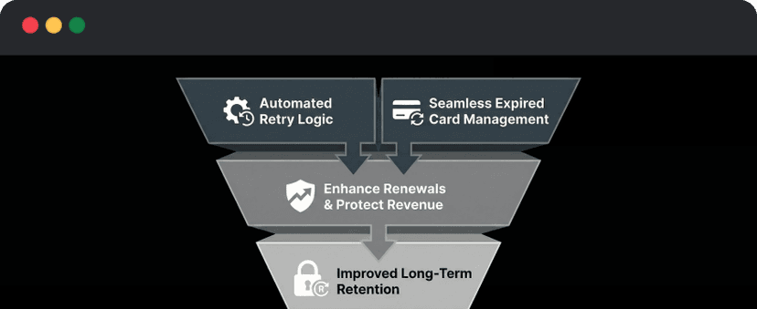 Automated retry logic and seamless expired card management help improve long-term retention.